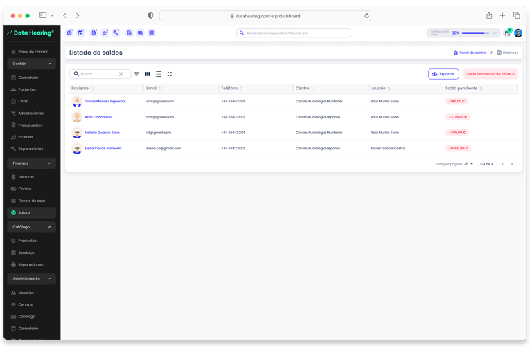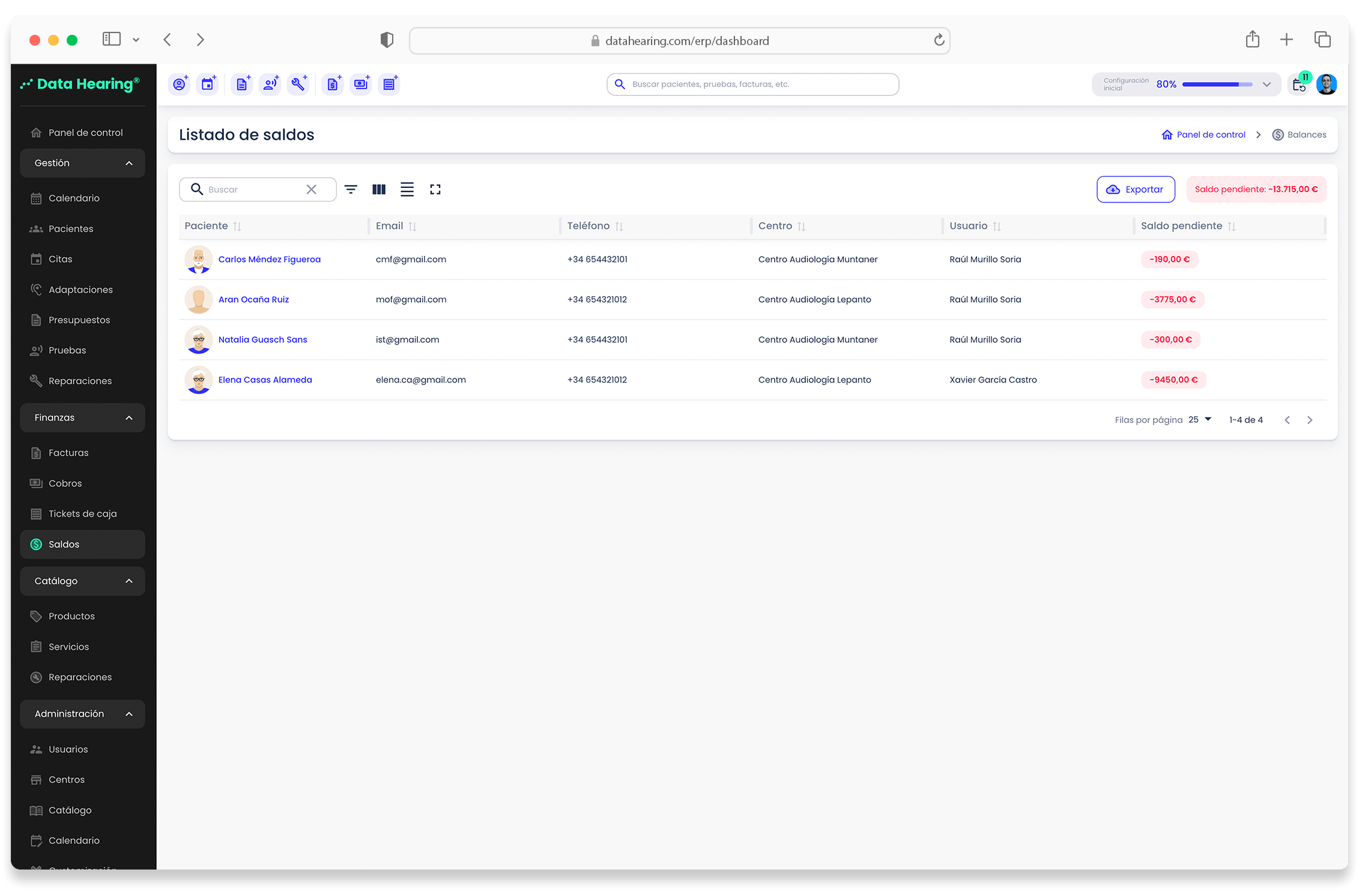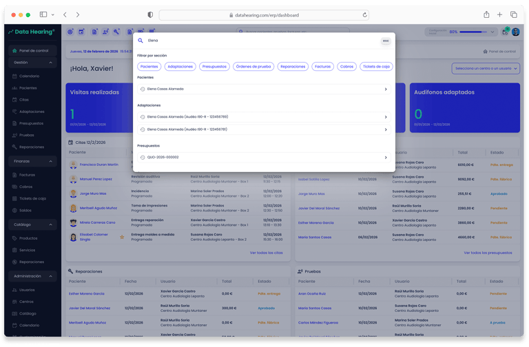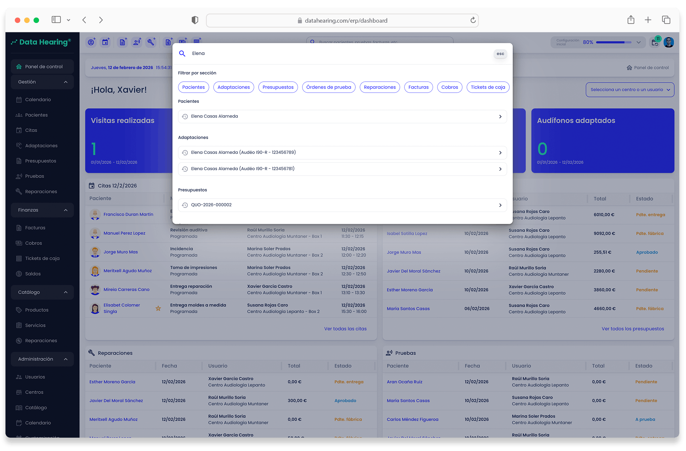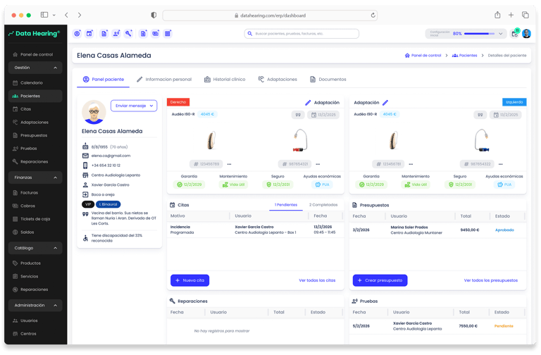 Visualiza toda la información del paciente, sus adaptaciones, servicios contratados, citas, presupuestos, reparaciones, facturas, cobros y devoluciones y calendario del centro asignado en un solo lugar y como nunca antes.