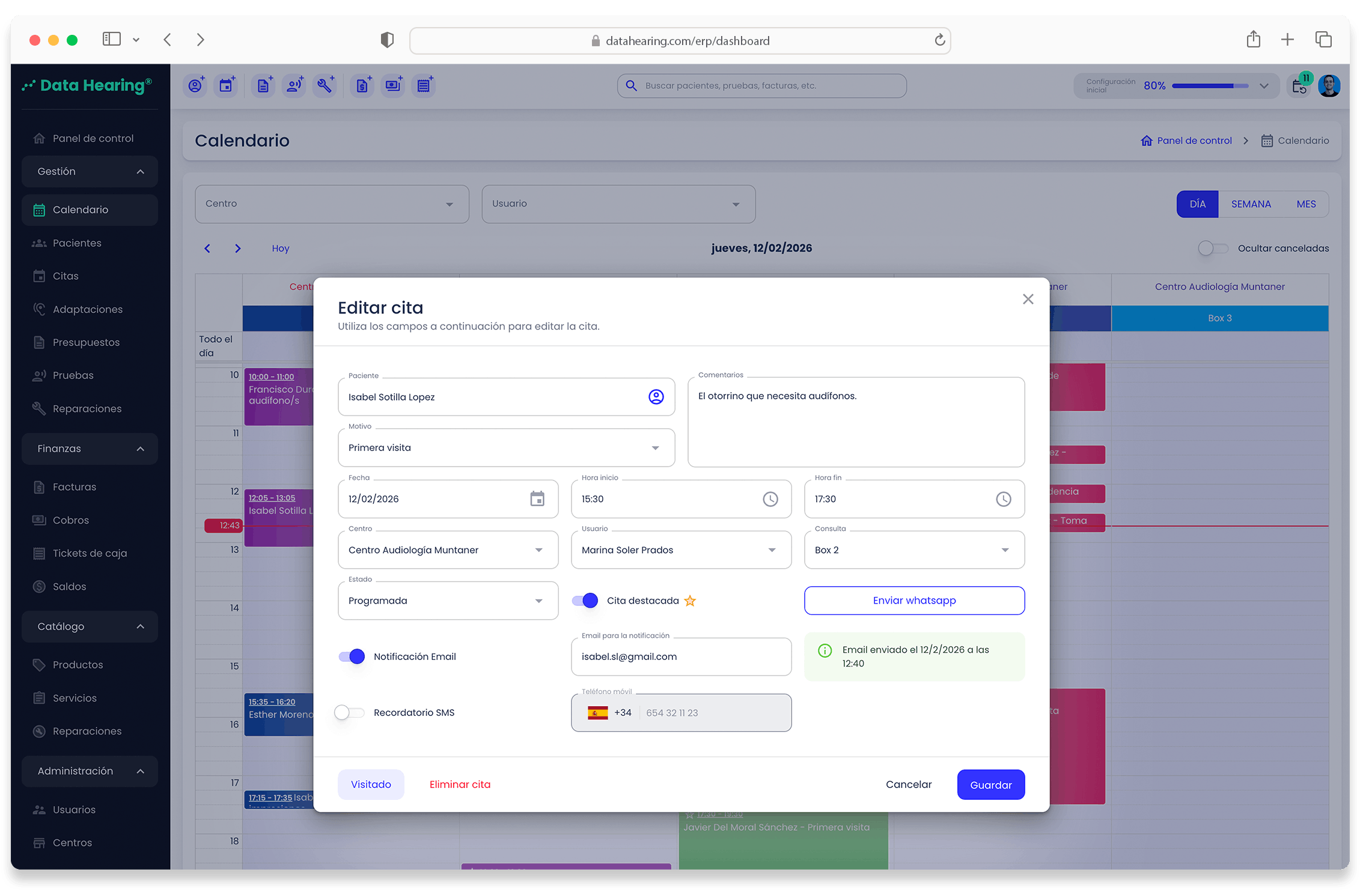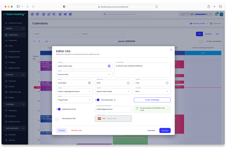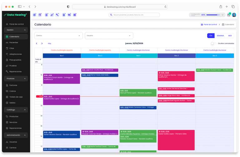 Citas detalladas con vistas por día, semana o mes para uno o varios centros auditivos simultáneamente.