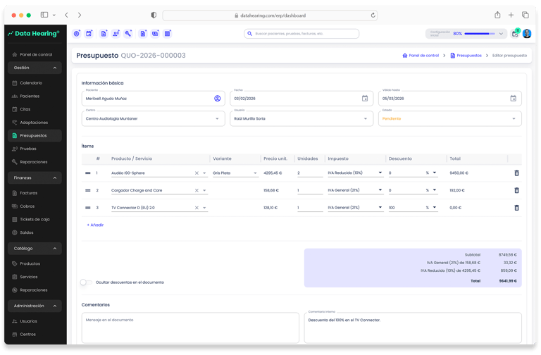 Data Hearing® está diseñado para ayudar a centros auditivos pequeños y medianos en la gestión diaria de ventas, finanzas, operaciones y recursos humanos de forma sencilla.